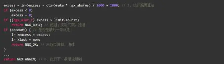 上述代码受限算出当前key上遗留的请求数,如果超过了burst,就直接拒绝;由于Nginx允许多条限速规则同时起作用,如果已是最后一条规则,则允许通过,否则执行下一条规则。
