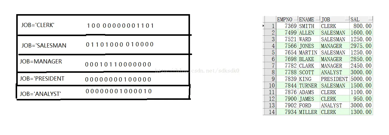 目的就是在emp中查出职位为salesman的员工信息,这里我们为其建立位图索引,结构如下图所示(纯手工绘图):