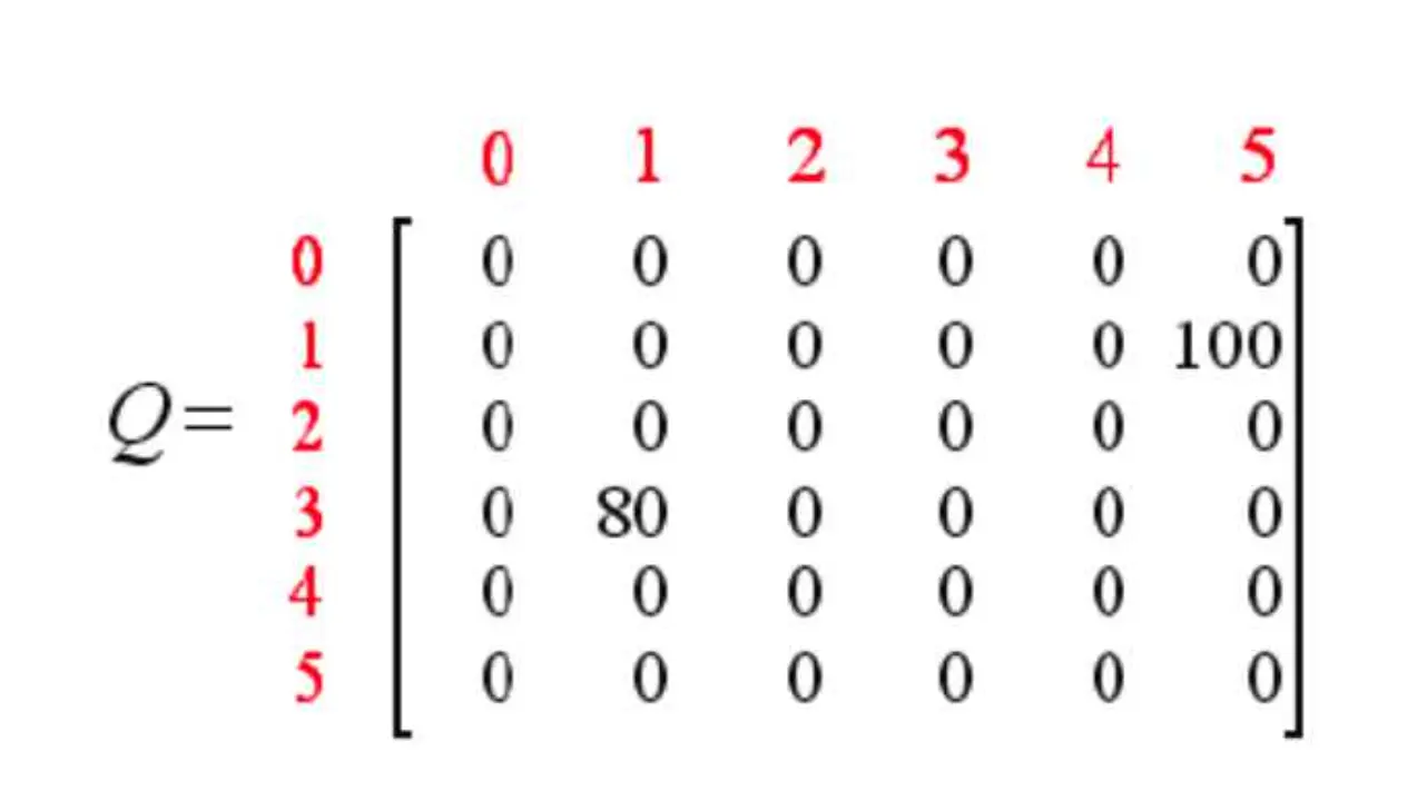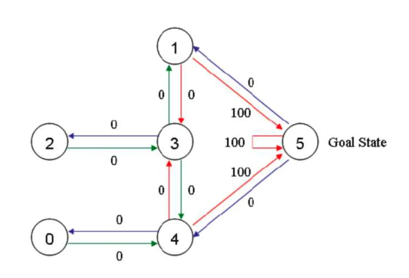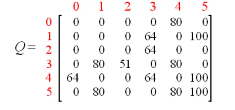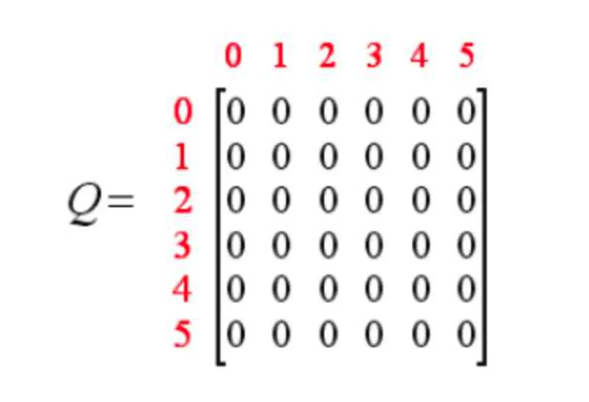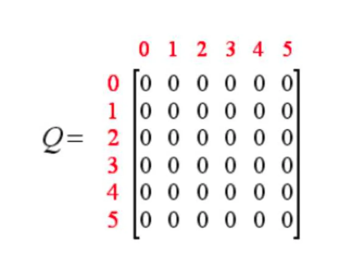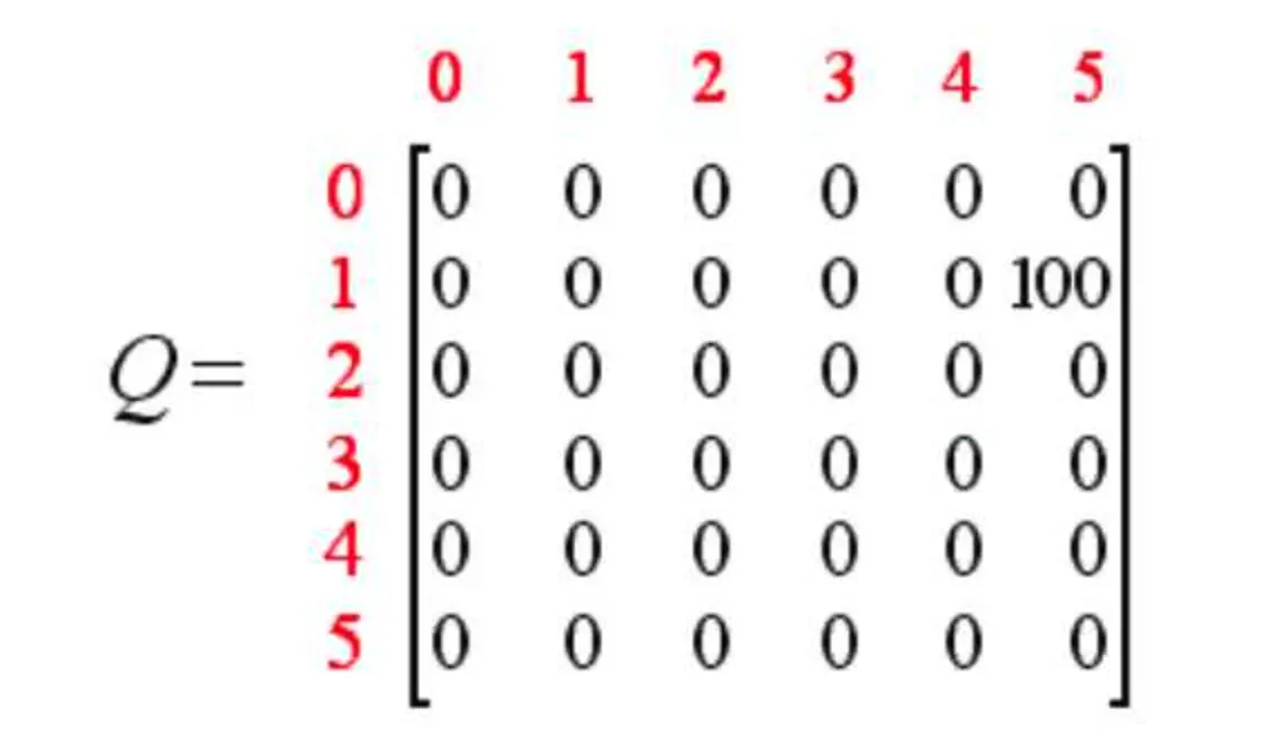 同时,我们创建一个Q表,表示学习到的经验,与R表同阶,初始化为0矩阵,表示从一个state到另一个state能获得的总的奖励的折现值。