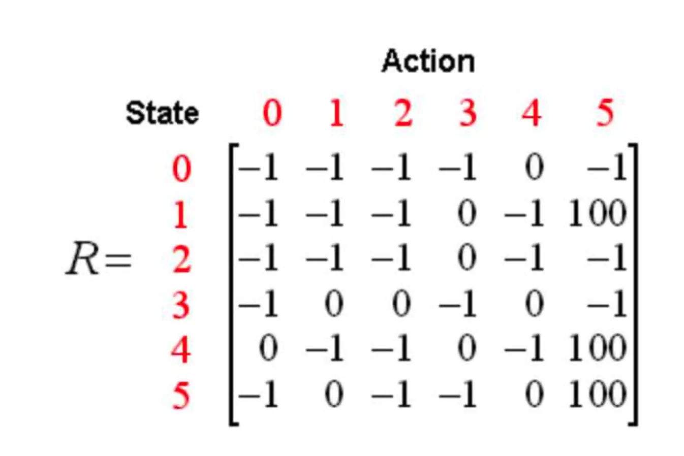 r = np.array([[-1, -1, -1, -1, 0, -1], [-1, -1, -1, 0, -1, 100], [-1, -1, -1, 0, -1, -1], [-1, 0, 0, -1, 0, -1],