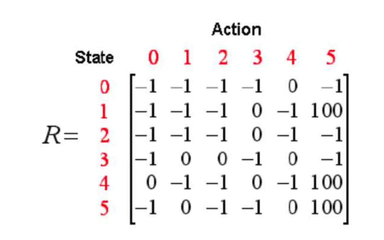 首先我们生成一个奖励矩阵矩阵,矩阵中,-1表示不可以通过,0表示可以通过,100表示直接到达终点: