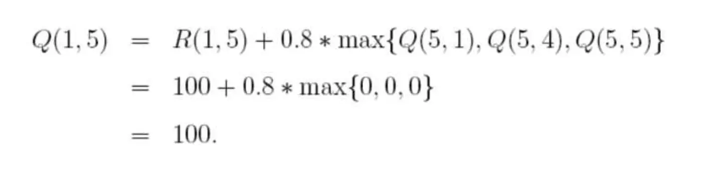 随机选择一个状态,比如1,查看状态1所对应的R表,也就是1可以到达3或5,随机地,我们选择5,根据转移方程: