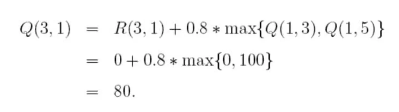 这样,到达目标,一次尝试结束。 接下来再选择一个随机状态,比如3,3对应的下一个状态有(1,2,4都是状态3对应的非负状态),随机地,我们选择1,这样根据算法更新: