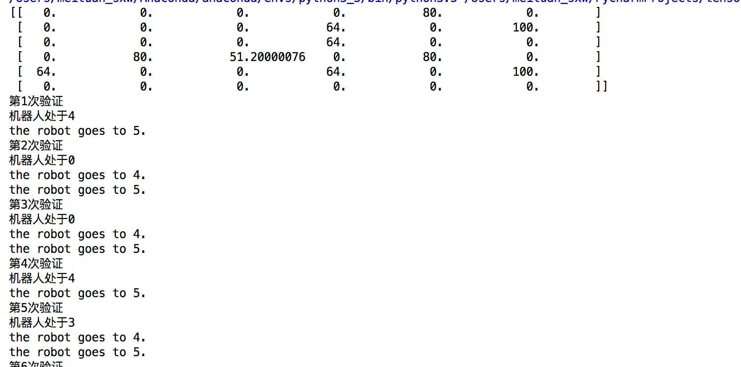 举例来说,假设我们的初始状态为2,那么根据Q表,我们选择2-3的动作,然后到达状态3之后,我们可以选择1,2,4。但是根据Q表,我们到1可以达到最大的价值,所以选择动作3-1,随后在状态1,我们按价值最大的选择选择动作1-5,所以路径为2-3-1-5.