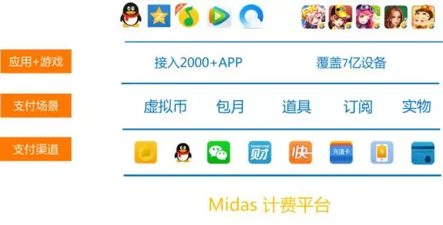 Midas计费,目前已经接入2000+ APP,60多万家商户,覆盖国内10+和海外40+渠道,托管账户总量200多亿,每日流水稽核500多亿条,基本上涵盖了所有常见的计费模式,如虚拟代币购买、道具、订阅、实物等,是一个全方位的一站式计费平台。