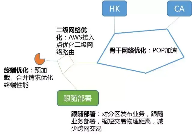 Midas海外计费,目前主要部署在香港(HK)和加拿大(CA)两大公司自有IDC,及南北美、欧洲、澳洲的AWS,还有部分是合作伙伴机房。在这些区域间,涉及到多级骨干网,二级网络和本地运营商网络,物理路径长,时耗常不稳定,我们通过利用公司全球POP加速点的部署,结合分析海外网络结构特点,建设了8个自营的交易中心入口,并利用智能DNS远程代理方式,来优化如AWS的接入点,最终有效避开了局部经常性的网络异常,加之终端的针对性优化,如预加载,请求合并等,成功将全球17个地区单次通信平均时耗明显降低。