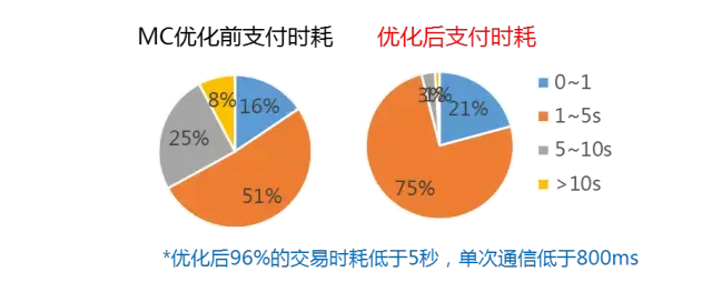 下图是MC的优化前后支付时耗图,可以看到优化后平均单次通信时耗都降到了800ms内。
