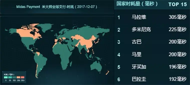 计费走向海外国际化,所要面对的首要核心问题就是地域跨度,从下图即2017-12-7日的Midas全球各区域实时支付时耗图就可以看到,内部网络单路径的时耗,经常性约200ms左右,作为对比,深圳到上海的时耗一般都在50ms以内,而实际的请求往往要经历多次路径接力,特别是从用户终端到就近接入点,耗时更久,这对系统流程控制、监控、发布等都有挑战。其次,随着部署地域的增加,不同地区的网络结构,机器软硬件环境,及机器数都会有所限制,譬如在国内, 一整套计费系统一般机器数都在百台以上,而在海外某些地区,出于业务试水等情况,机器可能刚开始只有3~5台, 那么就需要有办法将数百台机器的计费系统缩减到只需3台即可正常运行。还有就是底层存储,需要能实现跨区域数据主动动态迁移。