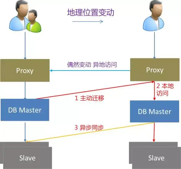 在跨地域情况下,严重的时耗问题使得远程访问代价过大,这时就需要有办法能将远程访问尽量变本地化,下图是我们考虑的策略,根据用户的就近位置来决定数据归属。如对同一个账户表,如果用户位置变动是短暂行为,则仍旧是远程访问原位置数据,如果位置明确变动,则会自动做数据的平滑迁移,即短期的数次远程访问后,会将数据搬到用户新的所在位置,变成快速本地访问,这可以明显降低交易时耗,提升用户付费体验。