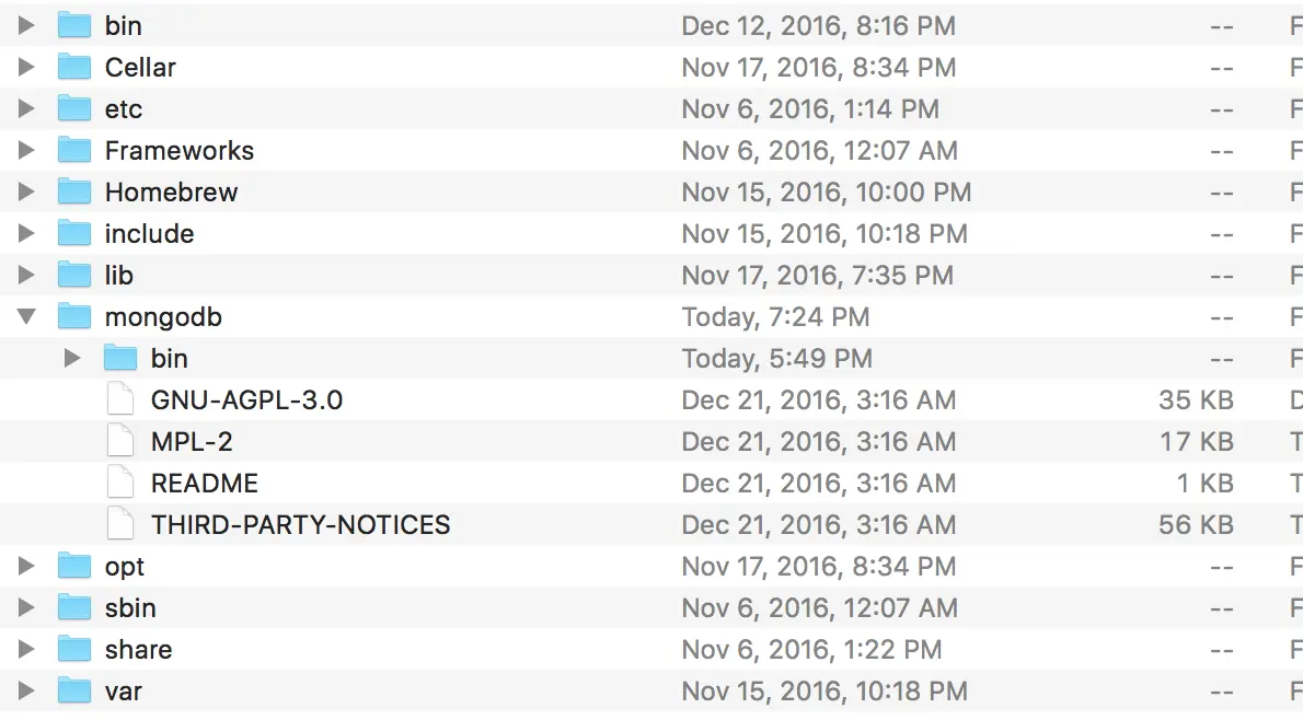 3. 上图中展示的就是我的本机的目录结构了,在/usr/local/mongodb/bin下就是mongodb的执行文件了