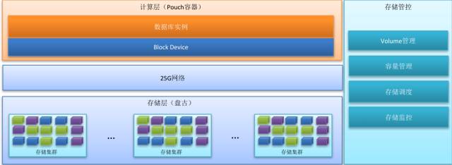 数据库存储计算分离架构如图,包括存储层、网络层和计算层,存储使用阿里自研分布式存储系统-盘古,数据库计算节点则部署在阿里自研容器(Pouch)中,通过25G网络与存储节点连接。