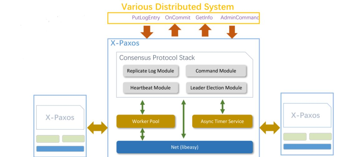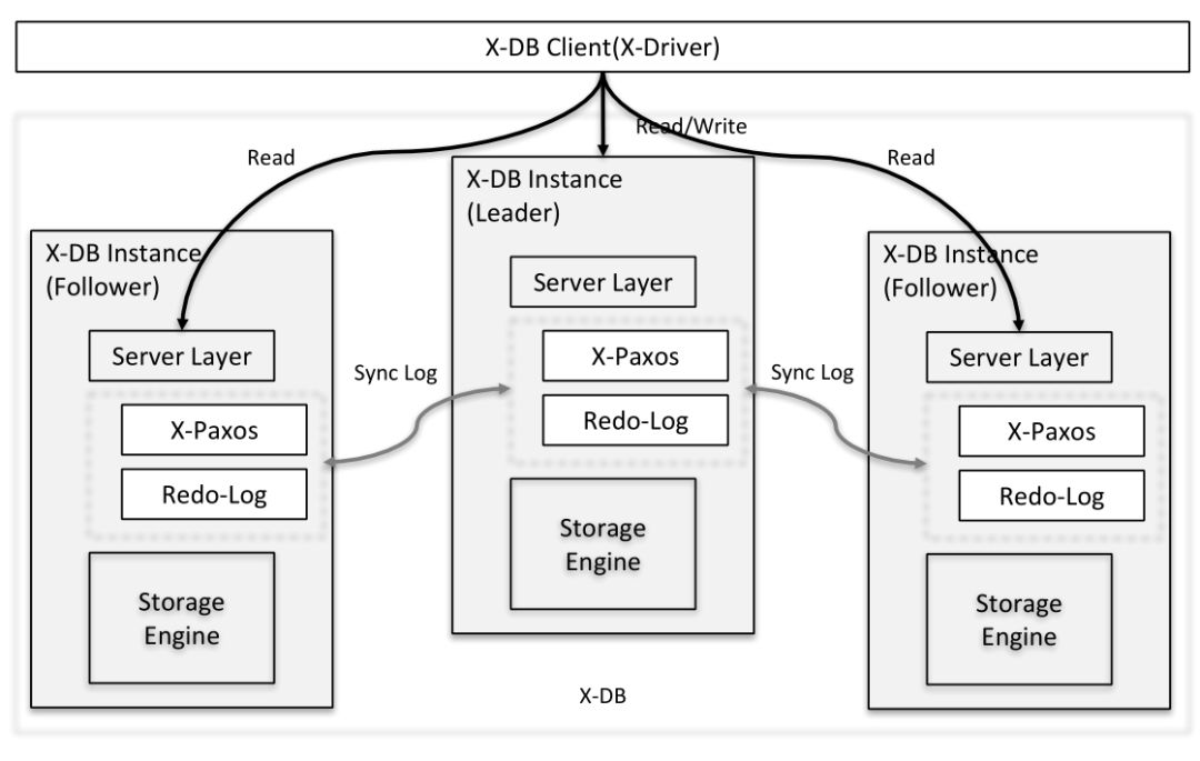 X-DB架构如图,引入Paxos分布式一致性协议解决问题;可异地部署,虽然网络延时增加,但能够保持高性能(吞吐),在同城三节点部署模式下,性能与单机持平,同时具备网络抖动的高容忍性。