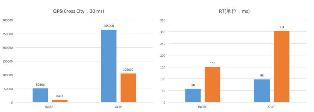 在异地部署模式下,sysbench标准化测试。Insert场景,X-DB(5.04万)性能优势特别明显,是MySQL GR(0.85万)的5.94倍,响应延时X-DB(58ms)是MySQL GR(150ms)的38%。