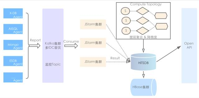 整个链路经历三代架构:第一代Agent + MySQL;第二代Agent + datahub + 分布式NoSQL;第三代Agent + 实时计算引擎 + HiTSDB