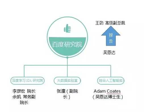吴恩达加入百度之前,百度研究院主要在北京,最开始仅有一个深度学习主题的研究院,即 IDL 研究院,李彦宏亲任院长,余凯系常务副院长。之后,张潼加入,又以副院长的身份组建了大数据实验室。再之后,跟着吴恩达 2014 年 5 月一起加入百度的斯坦福博士生 Adam Coates,又在硅谷组建了硅谷人工智能实验室。