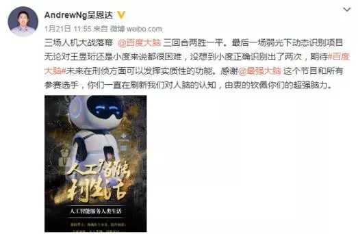1 月份,他带领的项目“百度大脑”机器人在综艺节目《最强大脑》中与最聪明的人类进行人机大战,最后以三回合两胜一平的成绩胜出。虽然是一档综艺节目,难免有些哗众取宠的味道,但是百度大脑在人机大战中胜出,还是一定程度上证明了百度 AI 的实力。