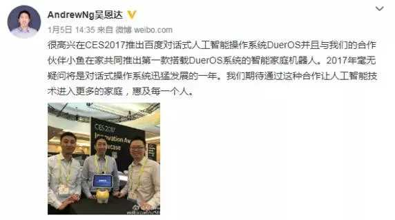 吴恩达在今年 3 月份离开百度之前,手头完成了一些重要的工作,如在 CES 大会山推出了对话式人工智能操作系统 DuerOS,并与合作伙伴小鱼在家共同推出第一款搭载该系统的智能家庭服务人。这与吴恩达让 AI 惠及每一个人的理想不谋而合。