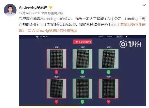 12 月 14 日,吴恩达又扔下一枚重磅炸弹,宣布成立 Landing.ai,同时宣布其已经与富士康在 7 月份达成了战略合作,将集两家的核心能力打造 AI 技术、人才和系统,包括产业链的管理、工人的培训等多个方面。