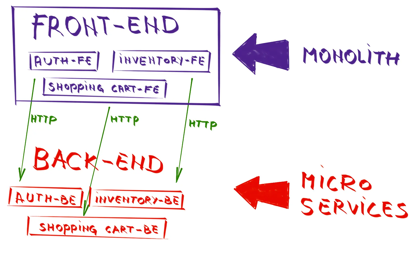 - 所有前端功能(身份验证,库存,购物车等)都是 Web 应用程序的一部分,并与后端(大部分时间通过 HTTP)进行通信,并将其分解为微服务。