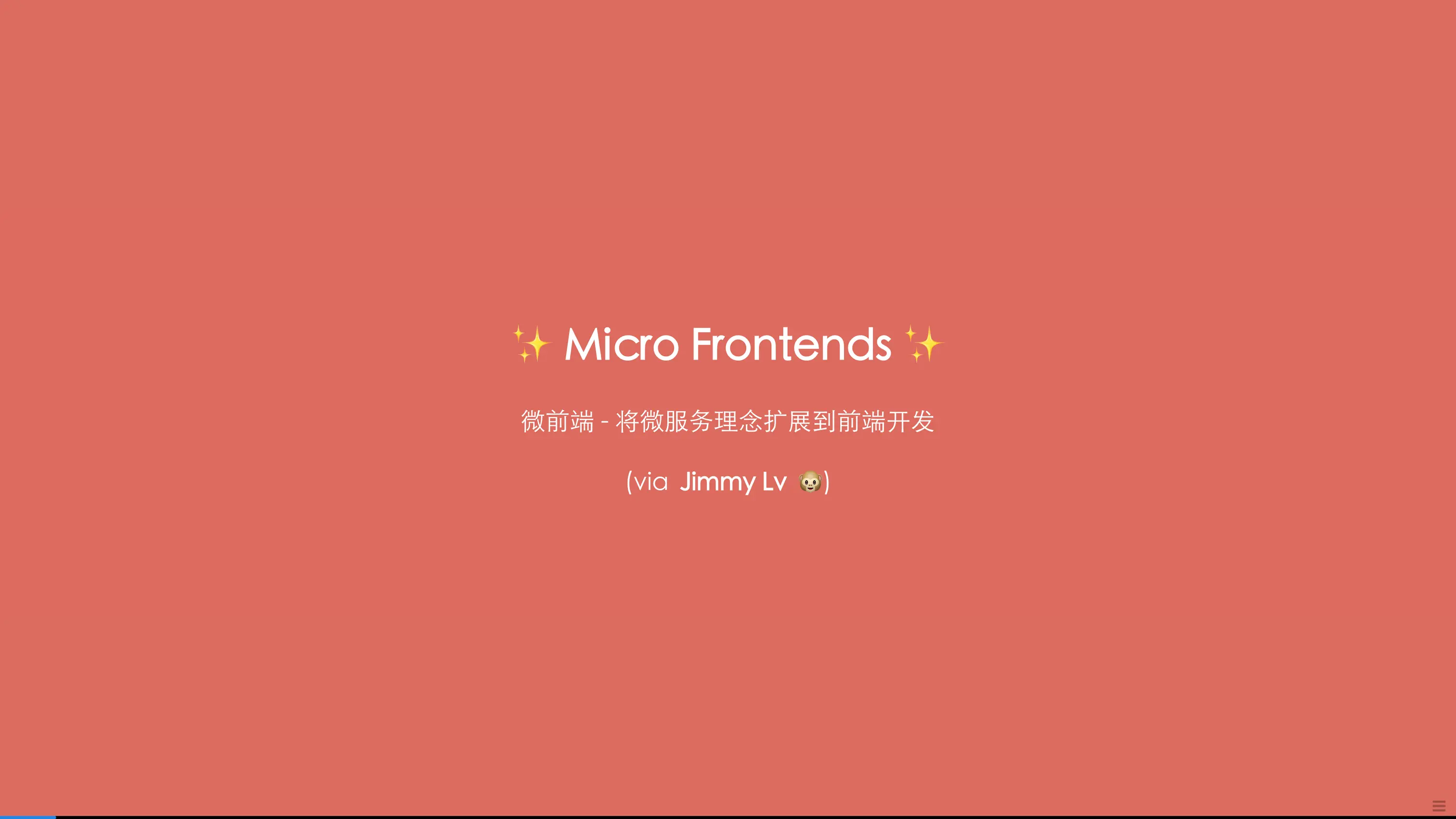 本次技术雷达「微前端」主题的宣讲 Slides 可以在我的博客找到:「技术雷达」之 Micro Frontends:微前端 - 将微服务理念扩展到前端开发 - 吕立青的博客