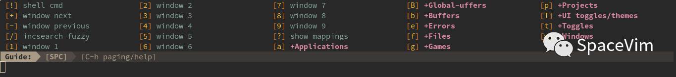 快捷键辅助系统: SpaceVim 所有快捷键无需记忆,当输入出现停顿,会实时提示可用按键及其功能。