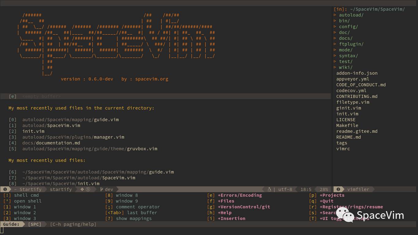 详细的文档: 在 SpaceVim 通过 :h SpaceVim 来访问 SpaceVim 帮助文档。