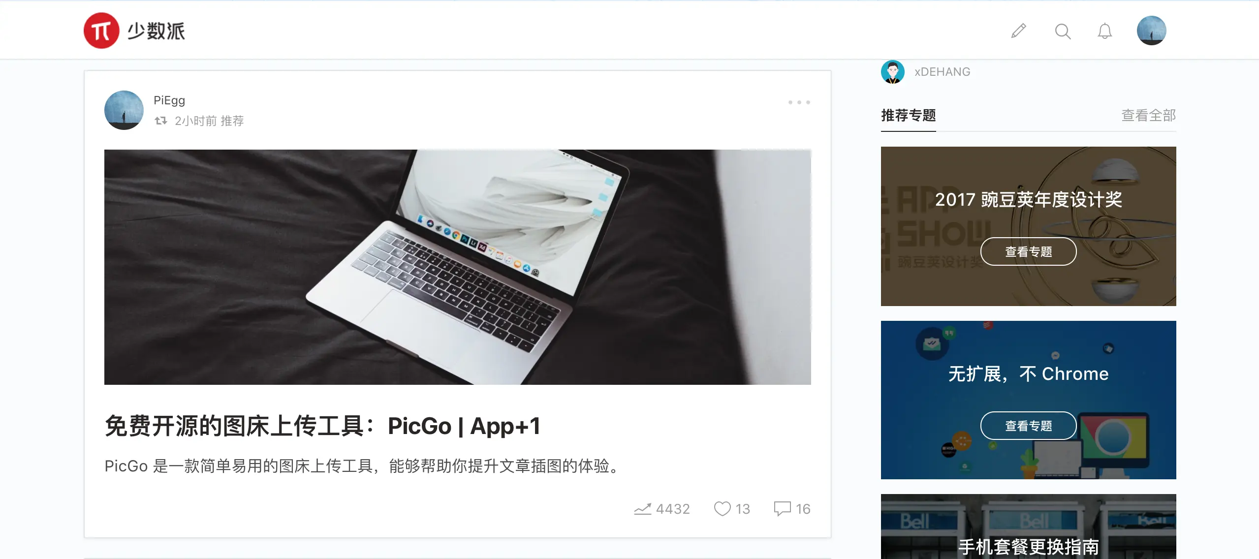 2017.11.18 开坑PicGo,学习electron的基本开发流程,边写边学。最终完成了一个我现在写博客贴图片时很方便的工具。并于12月中发布正式版,还上了少数派首页推荐。【electron】