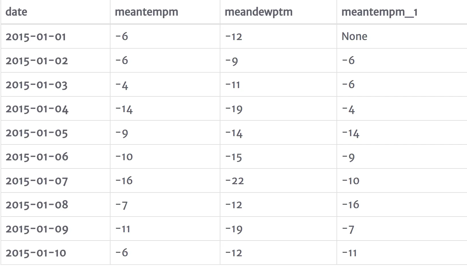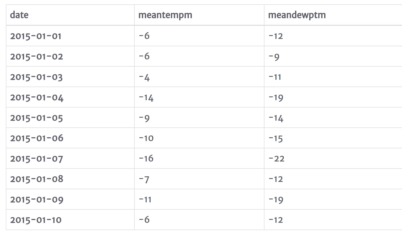 tmp = df[['meantempm', 'meandewptm']].head(10)