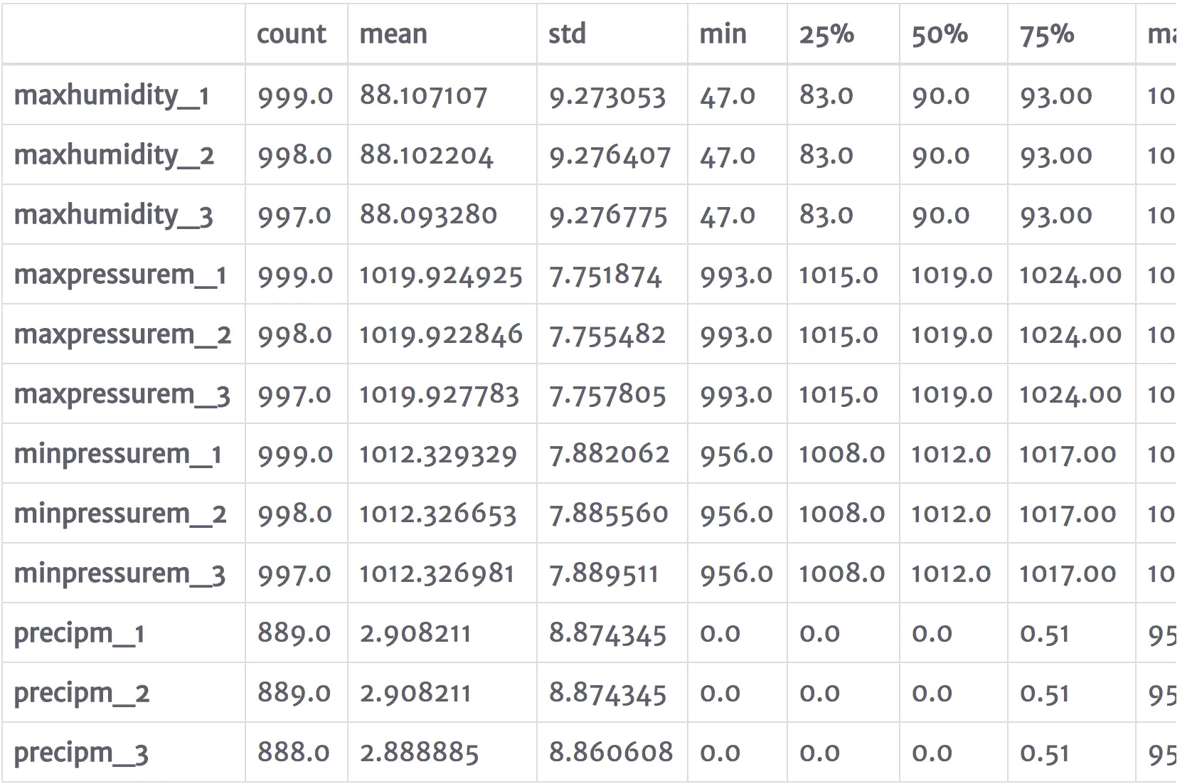 "mintempm", "maxdewptm", "mindewptm", "maxpressurem", "minpressurem", "precipm"]