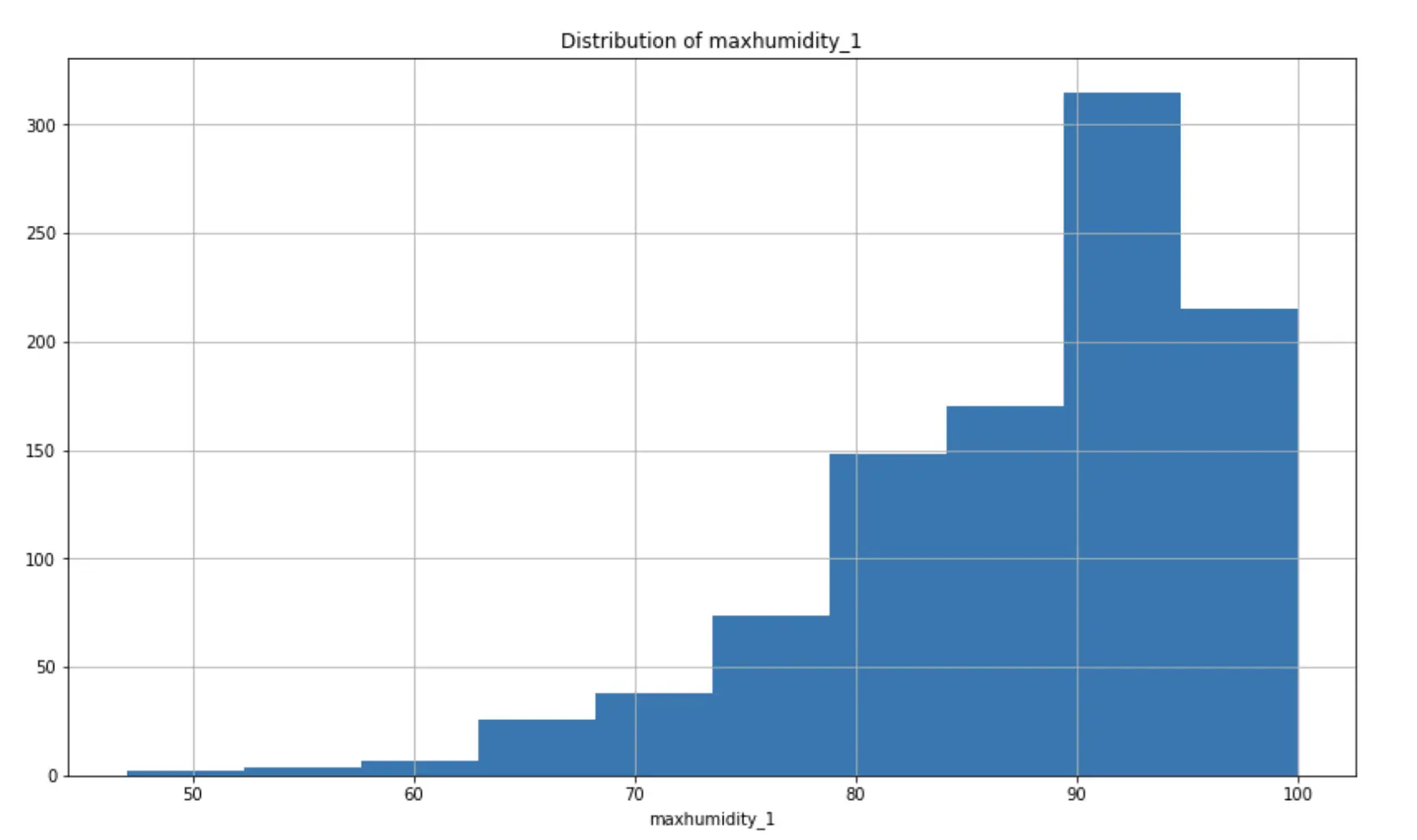 查看maxhumidity字段的直方图,数据表现出相当多的负偏移。 在选择预测模型和评估最大湿度影响的强度时,我会牢记这一点。 许多基本的统计方法都假定数据是正态分布的。 现在我们暂时不管它,但是记住这个异常特性。