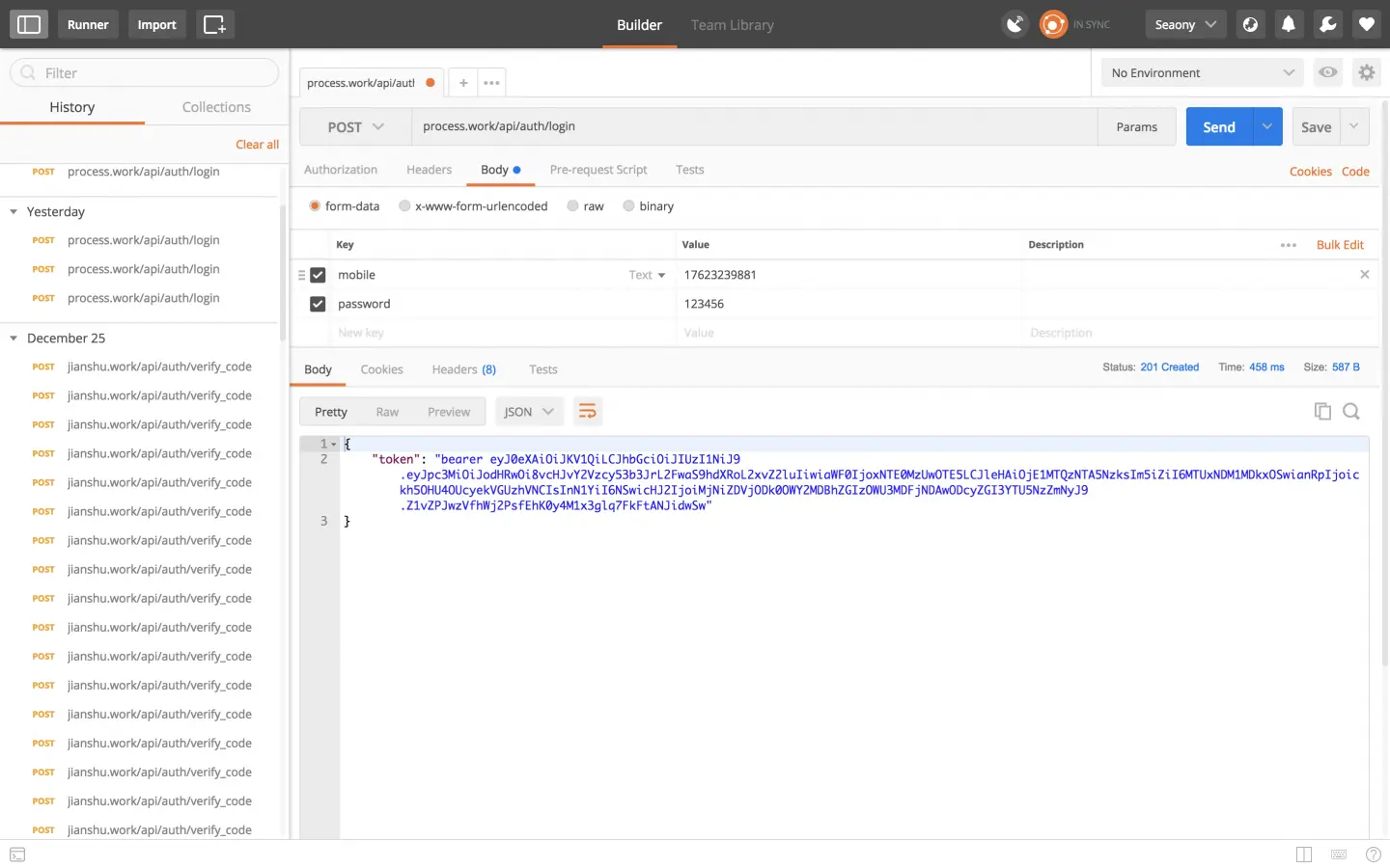 // 使用 Auth 登录用户,如果登录成功,则返回 201 的 code 和 token,如果登录失败则返回
