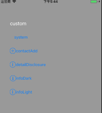 - UIButtonType.infoDark:为感叹号“!”圆形按钮