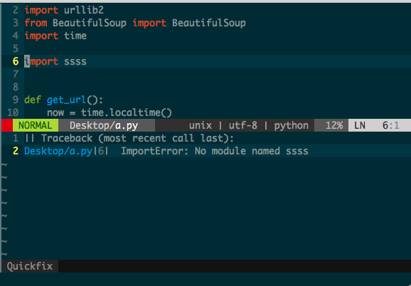 但是这个一键执行有一个小问题,由于quickfix的原因,不支持标准输入input()和raw_input(),只要代码中有这两个函数,100%卡死,目前这个问题貌似还无解。如果不用quickfix就可以支持输入,但是在终端中使用的话就是跳回终端输入和输出;使用macvim的话又会出现输出数据很多时就无法查看全部。由于我在写python是标准输入用的较少,就决定放使用quickfix来保证实用和美观。