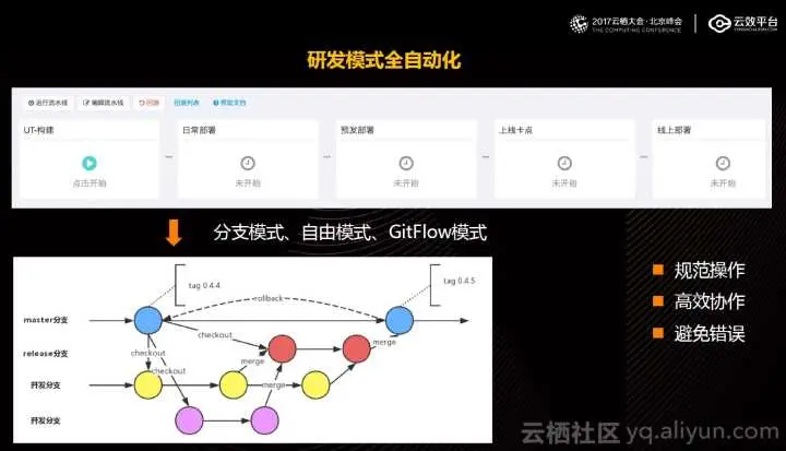 说起自动化我们就想到了流水线,但是仅仅是流水线还是不够的,它仅仅解决的是发布过程自动化问题,并无法完全解决开发者的日常协作问题。比如什么时候拉分支,什么时候合并代码,需要达到什么样的标准,发布分支怎么处理,如何和流水线自动的结合起来。这些才是开发日常工作中最繁琐,最容易出错的事情。