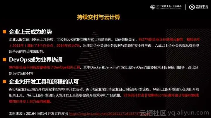 这是我从2016中国软件开发者白皮书中摘录的一些信息。首先看到的是企业上云成为趋势,因为上云可以大大减少我们的it成本,不管是公共云还是私有云。目前来看私有云还是首选,最近3年从7%增长到27%,混合云是目前比较流行的玩法。