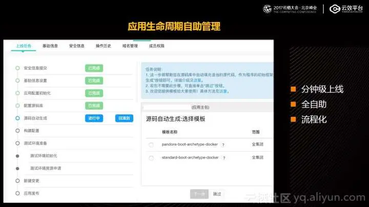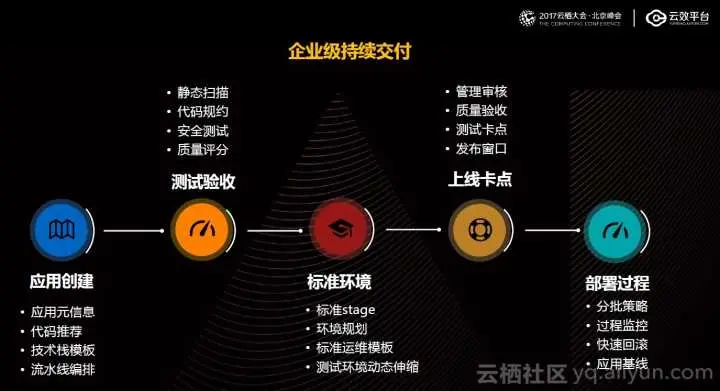 第一个阶段应用创建,元数据维护,代码推荐,技术栈模板,流水线。第二是测试验收,静态扫描、代码规约、安全测试等等。测试完成我们需要部署,就涉及到环境的标准化,企业统一的环境规划,运维模板和云化的动态伸缩能力可以为我们大大节省成本。最终要发布前还需要管理审核、验收卡点、发布窗口等等管控策略。最后上线过程一定需要分批滚动、过程监控和快速回滚能力。