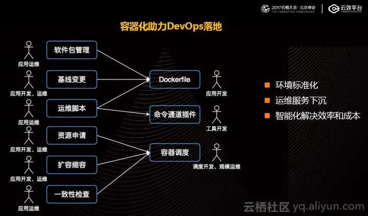 大家可以看这个图,左侧是在容器化前,我们要做的事情和所需要的角色。软件包管理、基线变更、运维脚本的修改、资源申请、扩缩容等等,哪个工作离不开运维工程师。这些事情门槛高,手工程度大,变更方式复杂,最终导致两个角色协作效率低下。