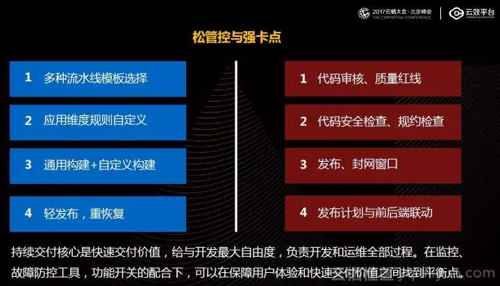 持续交付核心是快速交付价值,给与开发最大自由度,负责开发和运维全部过程。在监控、故障防控工具,功能开关的配合下,可以在保障用户体验和快速交付价值之间找到平衡点。