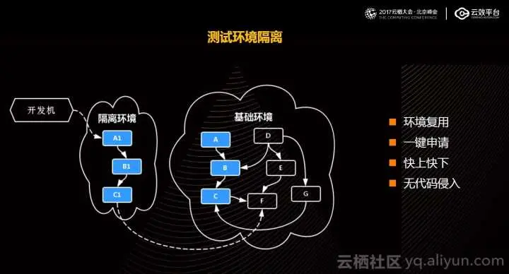 下面我们看下测试环境,大家可别小看了线下测试所带来的资源成本。在阿里目前线下测试物理机规模已经达到数万台。随着微服务化的推进,应用数量和依赖复杂度都被迅速放大,如何管理好测试环境和资源已经变得非常棘手。