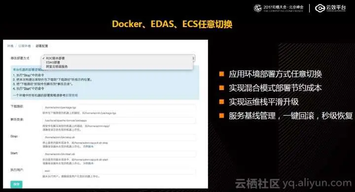 云效目前支持Docker、Edas、Ecs三种部署方式,对每个应用的每个环境都可单独定义它的部署方式,并且实现任意切换,方便快捷。比如我们生产环境使用edas保障稳定,测试环境使用ecs混合部署节省资源都是可以实现的,非常方便。