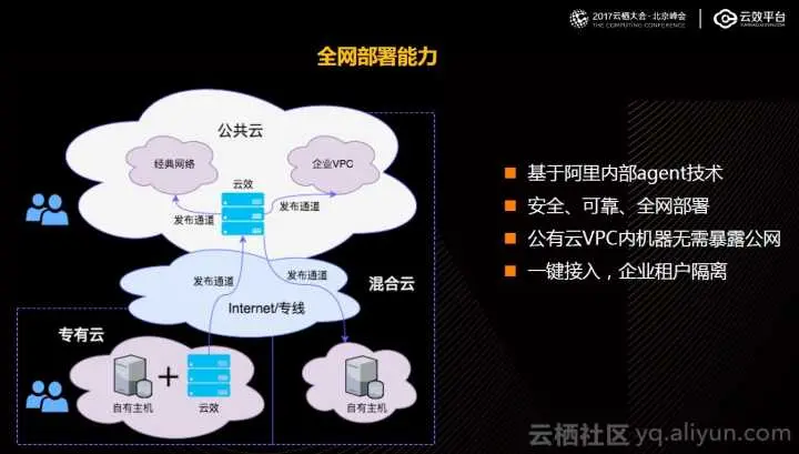 再看下部署能力,不管是公共云,还是专有云,还是其他云主机,云效都可以接入并执行部署。他是基于阿里内部的agent的技术,安全高效,此技术已经在阿里巴巴全网部署并且经过多年改进。