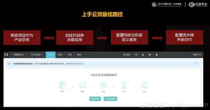 最后我们看看如何通过云效提高研发效能。首先可以通过首页的快速开始完成创建产品空间,创建代码库,选择我们的研发模式,创建应用,也就是刚我们所说的非常重要的基础元数据。然后配置构建、机器、部署规则,并通过流水线完成交付。