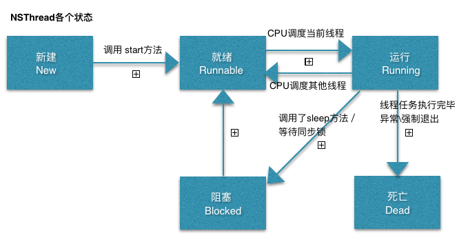 我认为线程的状态有这么五种情况:新建状态,就绪状态,运行状态,阻塞状态,死亡状态(这里可能会有歧义,我将其他的多种状态也进行了合并,如等待状态、锁池状态等)。他们的关系如下图所示: