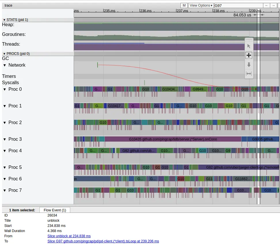 抓的这一段图,红线箭头是指收到网络消息,ublock了goroutine的Read操作。注意,从网络消息可读,到读网络的goroutine被再次调度,中间花费了4.368ms !!! 我甚至找到一些更极端的场景,从收到网络消息可读,到goroutine实际被唤醒,花费了19ms。这里先插入讲一下业务情况,出于性能考虑,业务实现是做了batch的,所以请求都会通过channel转发到一个goroutine上,由那个goroutine去batch的发请求。显然这个goroutine是非常关键的,因为其它的goroutine都是依赖于它。这里ms级别的调度延迟,直接会对业务整体延迟产生很大影响。