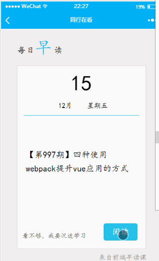 前段时间被安利了一个很实用的公众号—前端早读课,它简洁、大方的页面和方便、实用的功能深深地吸引着我~(^U^)ノ 恰好这段时间学了小程序,就自己仿着写了个前端早读课的小程序。