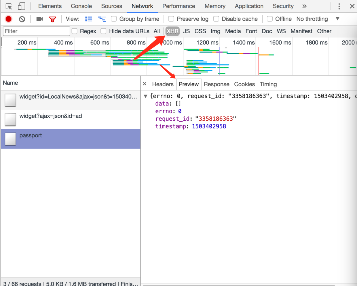 接下来我们点击 🚫 图标清除一下已显示的数据。并点击百度顶部的新闻按钮,并在 Network 中选择 XHR(XMLHttpRequest),就可以看到他的 XHR 网络请求。右下侧可以选择 Headers、Preview、Response 等。