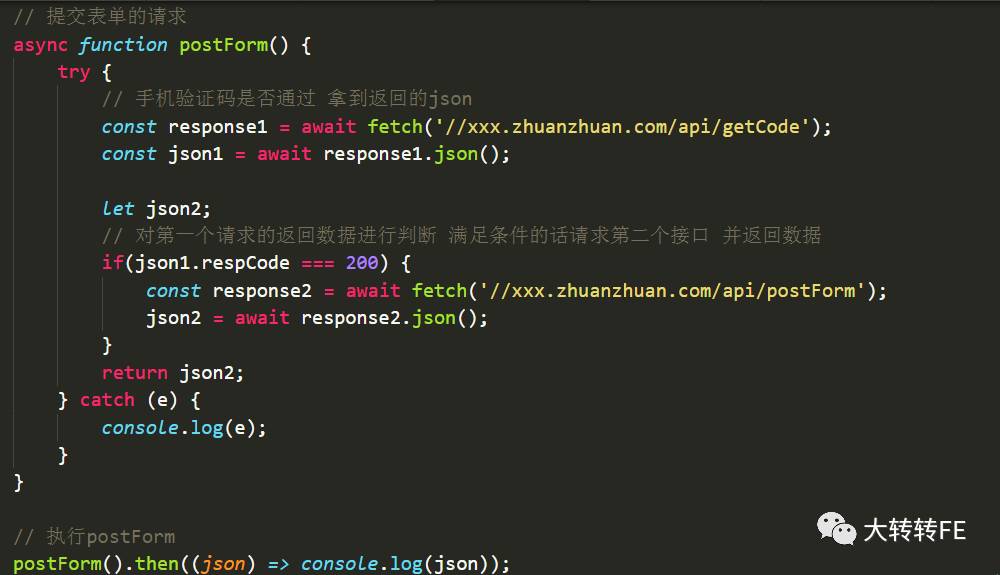 2、场景二,我曾经遇到过一个场景,一个提交表单的页面,里面有姓名、地址等巴拉巴拉的信息,其中有一项是手机验证码,我们不得不等待手机验证码接口通过,才能发出后续的请求操作,这时候接口之间就存在了彼此依赖的关系,Async跟Await就有了用武之地,让异步请求之间可以按顺序执行。