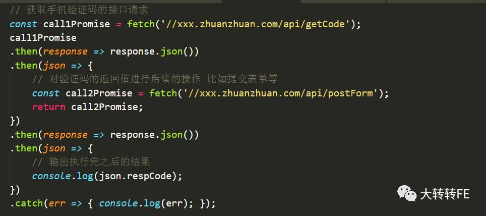 其中不用Async/Await的写法,我们不得不用.then()的方式,在第一个请求验证码的接口有返回值之后,才能执行后续的的Promise,并且还需要一个then输出结果,如下图: