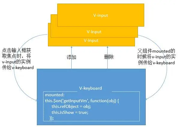 为了达到这样的目的,采用“当点击输入框获取焦点的时候,将当前v-input输入框组件的实例传给v-keyboard键盘组件”的方式。