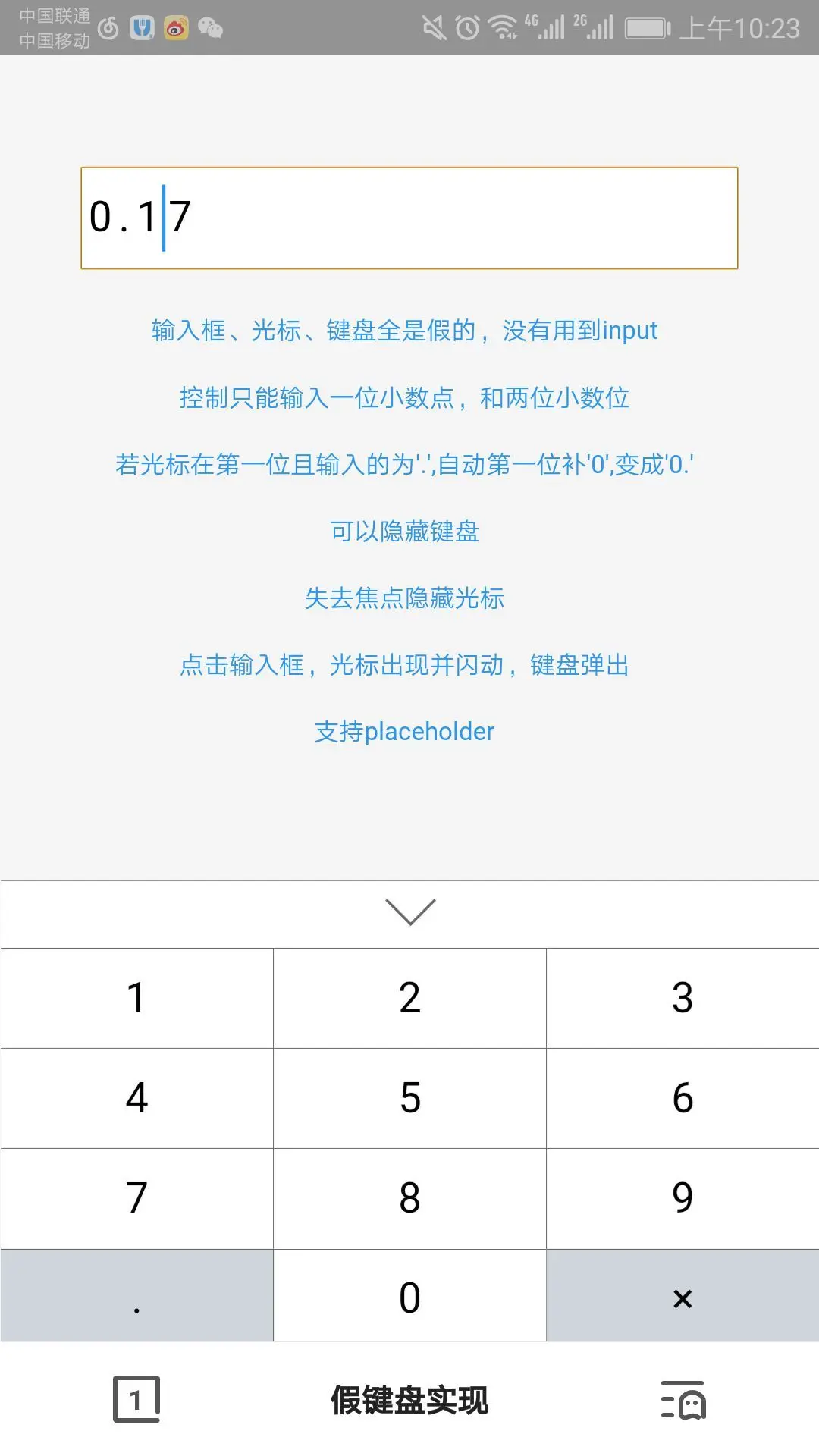 - 如果你是强迫症癌晚期患者,用户体验之上者,那么你就可以跟我一样做个假键盘,这样以上问题都不是问题。还可以添加附加功能,比如输入的时候若在第一位输入小数点的时候,前面自动补'0';删除的时候,若小数点在第一位前面自动补'0';还可以定制光标颜色、键盘样式等等。